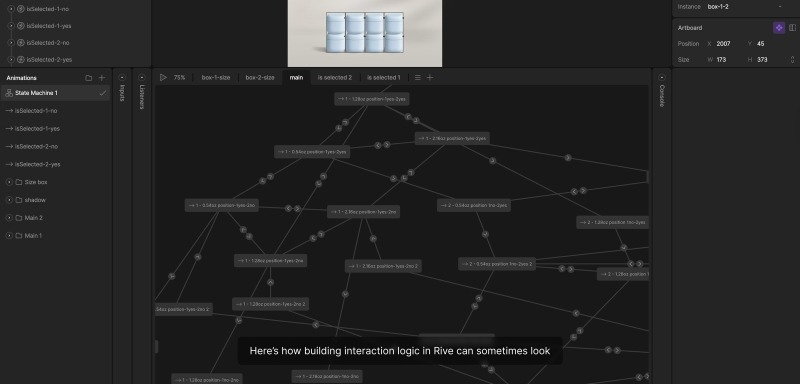 The possibilities of non-linear logic in Rive give me the flexibility to build complex systems hidden from the user while keeping the interaction on screen light and intuitive. It allows me to avoid overwhelming solutions. All the complex mechanics and settings remain behind the scenes — just like in ballet. Imagine: you’re sitting in the audience and you see the highly technical choreography, perfectly synchronized set changes, and a live symphony orchestra creating the atmosphere. You enjoy the performance, completely immersed in it, without even thinking about how much work and detail is hidden behind the stage. It’s the same here: the user dives into the process, enjoys the interaction, and doesn’t encounter the complexity of the implementation.