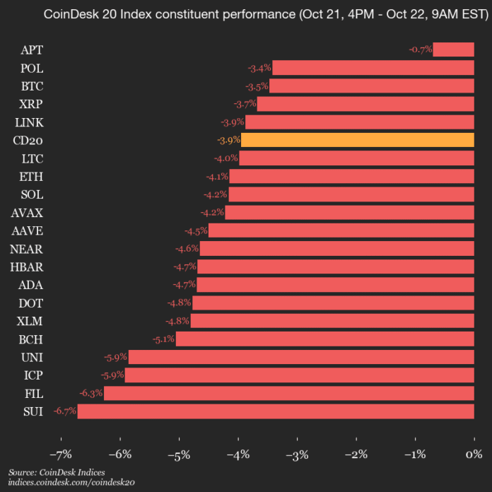 CoinDesk Indices presents its daily market update, highlighting the performance of leaders and laggards in the CoinDesk 20 Index.