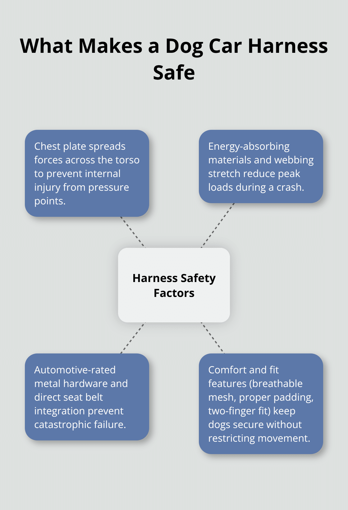 The harness chest plate determines survival rates during impact. Force distribution across your dog’s torso prevents concentrated pressure on single body points that cause internal injuries.