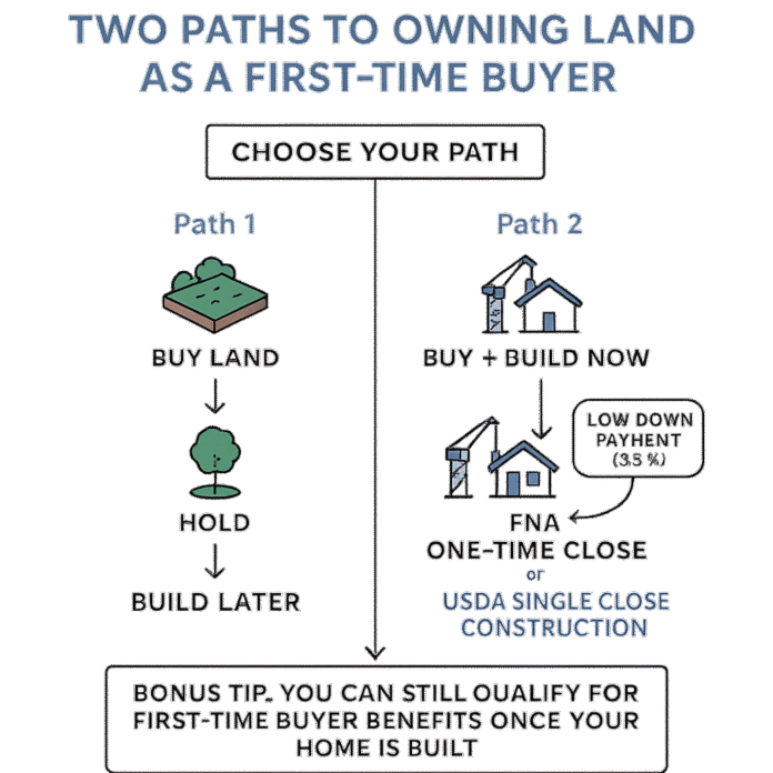 But if your plan is to buy land and build right away, first-time buyers can unlock powerful options through FHA One-Time Close or USDA Single-Close Construction Loans.
