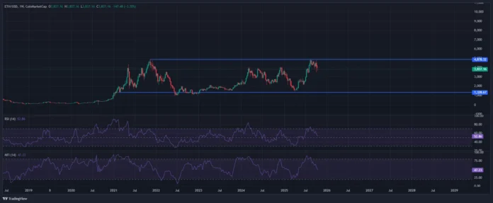 Ethereum’s monthly chart showed a multi-year consolidation zone between $1,228 and $4,878 since late 2021. At press time, ETH traded at $3,837.