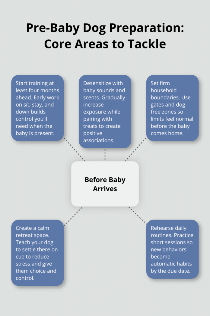 Begin behavior modifications at least four months before your due date. Most dog behaviorists recommend this timeline because it provides adequate time for behavioral changes to become permanent habits. Focus on basic obedience commands like sit, stay, and down first. These commands become essential tools when you need immediate control around your newborn.