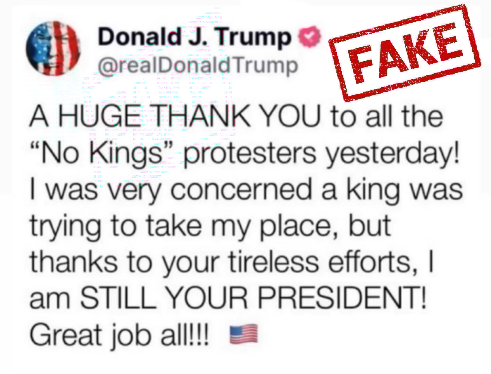 The fake tweet Rogan seemed to be talking about reads, “A HUGE THANK YOU to all the ‘No Kings’ protesters yesterday! I was very concerned a king was trying to take my place, but thanks to your tireless efforts, I am STILL YOUR PRESIDENT! Great job all!!!” But there’s nothing about it that’s real.