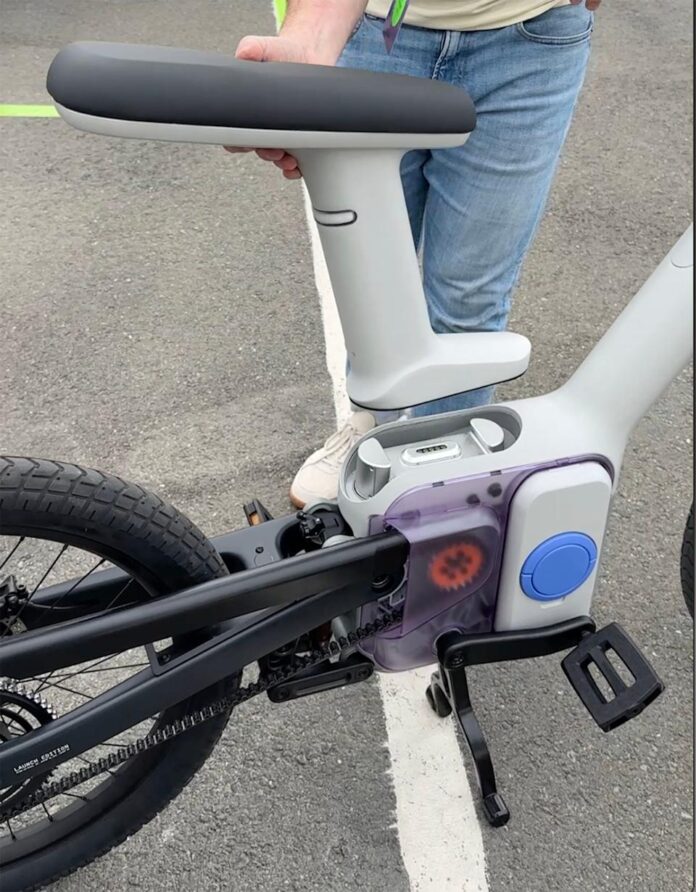 In terms of power, the TM-B’s throttle tops out at 20MPH though the bike can reach speeds up to 28MPH with added pedaling. Also is taking an interesting approach to its drive system, with a setup it’s labeled “DreamRide.” Instead of a mechanical connection between the bike’s rear wheel and the pedals, the TM-B uses “software-defined pedaling,”