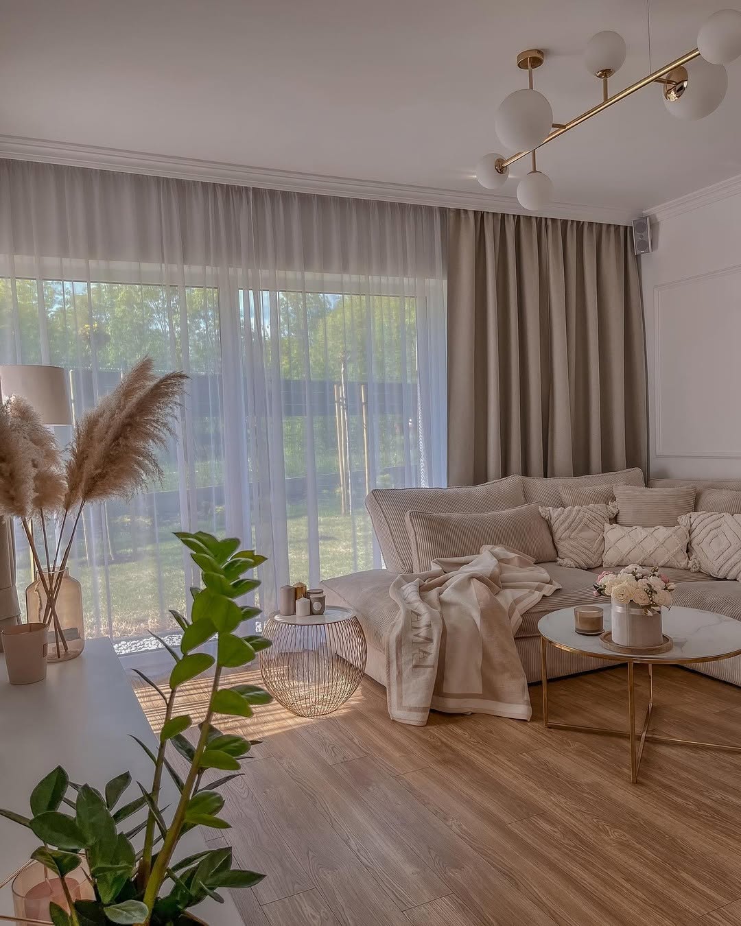 A neutral palette never goes out of style. In the fall, it becomes especially inviting. Combine warm whites, taupes, and browns to create a timeless look. Layer throws and pillows in different textures such as linen, knit, and boucle to add depth and softness. A touch of dark wood or aged brass gives the space a grounded, refined feel.