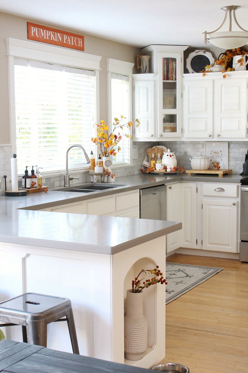 The kitchen can carry the season’s warmth with simple, intentional details. Use natural elements like wood and stone to bring texture and character. Arrange a basket of seasonal fruits or display ceramic mugs on open shelving. A small vase with dried branches or fall flowers can complete the scene with understated charm.