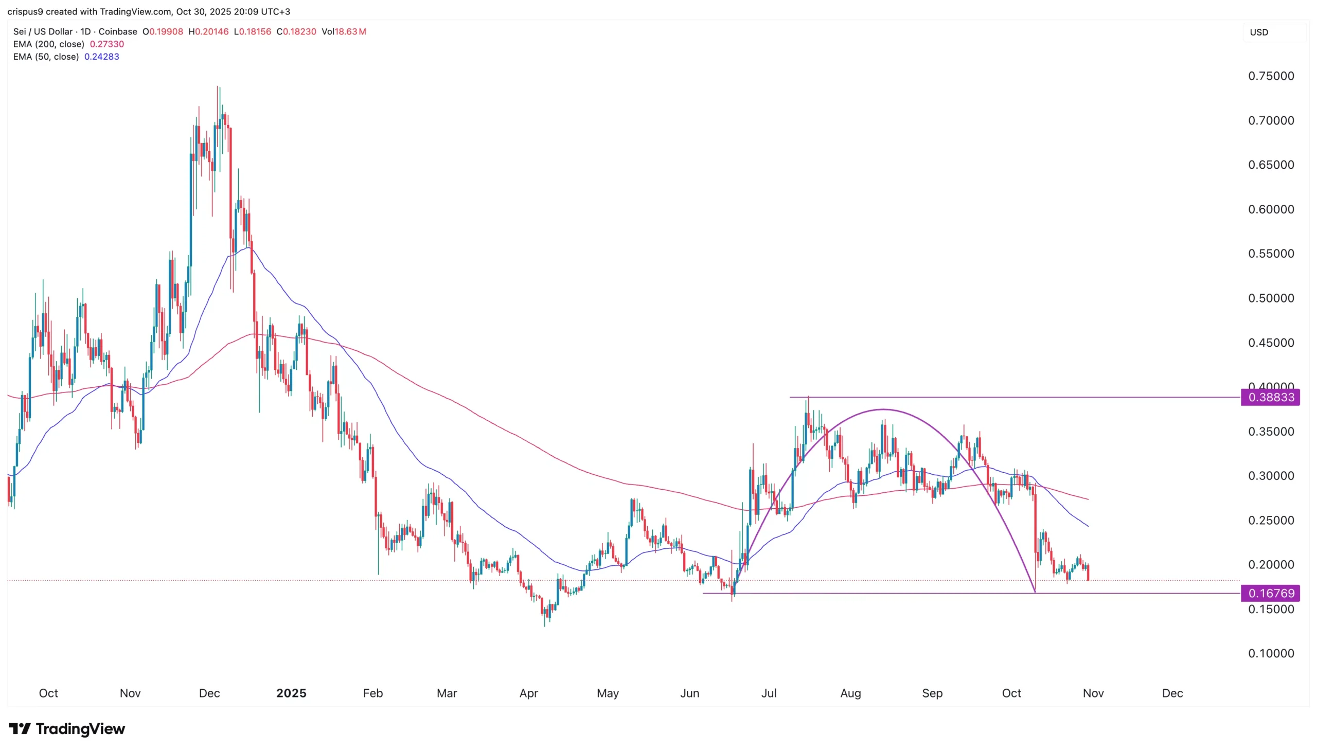 Sei (SEI) token dropped to $0.1835, down by over 50% from its highest point in August. It has also fallen by over 75% from its November highs.