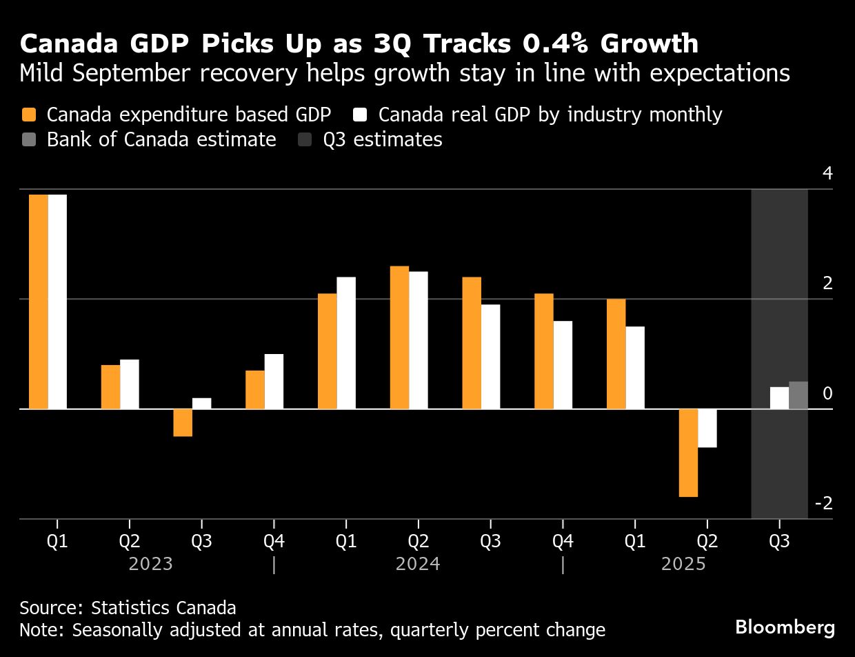(Bloomberg) — The Canadian economy appears to be on track to eke out growth between July and September, likely bouncing back from a second-quarter contraction but remaining weakened by U.S. tariffs.