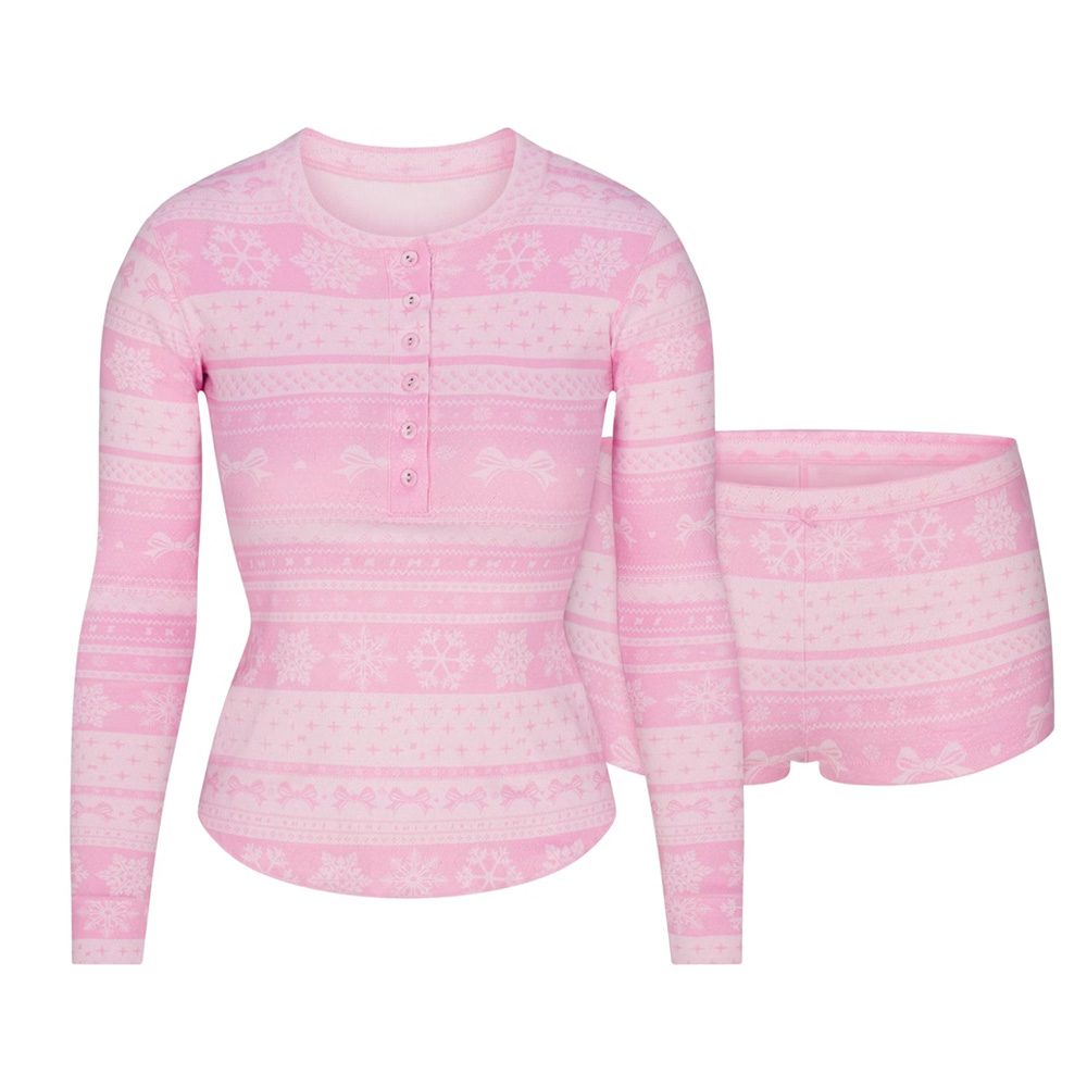 In case you’re long overdue for a pajama upgrade, fresh styles are already selling out fast, whether that be the Skims Sleep Long Sleeve Button Up Set in the new, limited-edition Cranberry Vintage Deer Print or the Skims Logo Plush Pointelle Henley Set, with its Fair Isle design in deep navy and white.