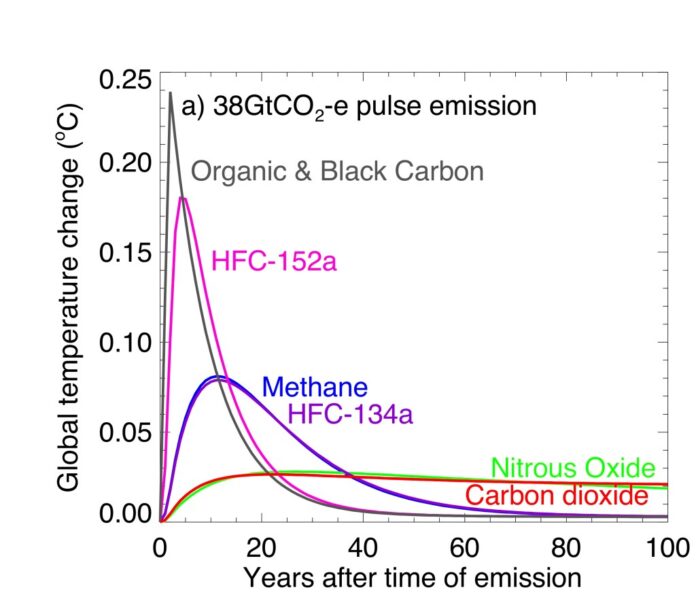 These metrics highlight that methane is a potent greenhouse gas that can contribute substantially to global warming. The problem is that the interpretation of these metrics is not actually correct. These metrics are computed by integrating the radiative forcing of a pulse of emissions over the relevant time period. However, this doesn’t necessarily correctly represent the warming due to this pulse of emission.