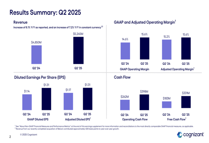 Stock Market News Cognizant Q2 2025 slides: Revenue up 8.1%, Belcan acquisition boosts growth By Admin - November 1, 2025 0 6 FacebookTwitterPinterestWhatsApp Cognizant Q2 2025 slides: Revenue up 8.1%, Belcan acquisition boosts growth