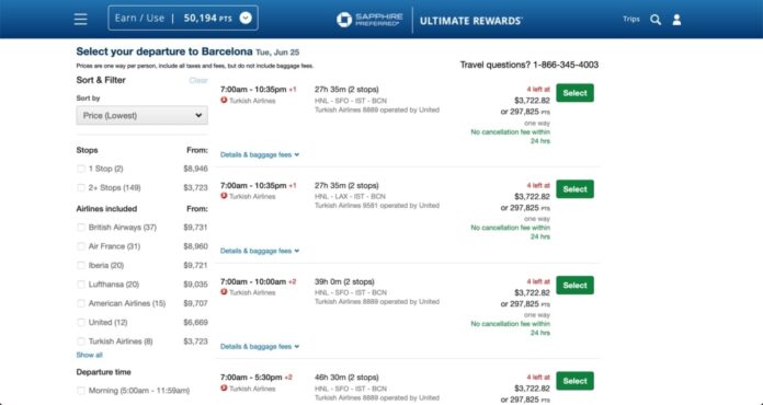 Inside the Chase Ultimate Rewards Booking Portal. These Turkish Airlines flights are actually run by United