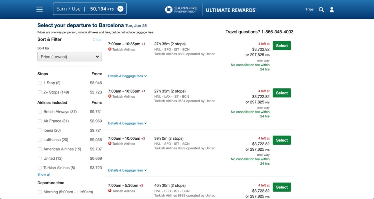 Knowing that United had the best flight between HNL and BCN, and knowing that the Chase Booking Portal didn’t offer a very good point valuation on this flight, I decided to check the United website directly.