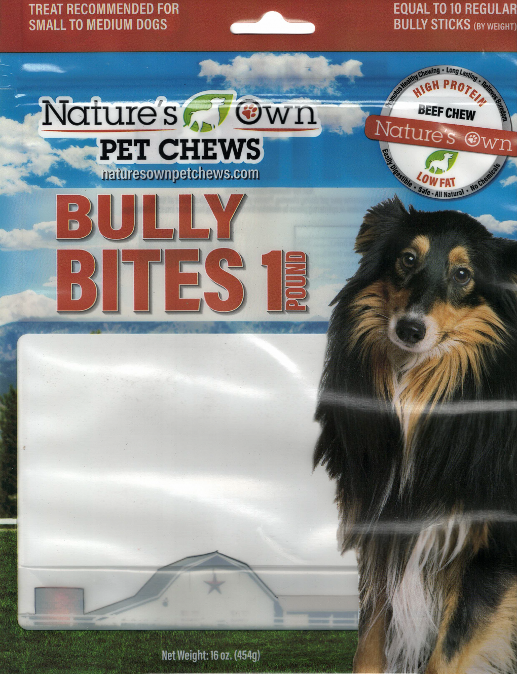 Nature’s Own Pet Chews brand Bully Bites, UPC# 739598900750, are sold in a 16 oz., resealable plastic pouch 11” high, 9.5” wide, 3.5” deep on the bottom and have a Best Buy date of September 2027 located on a tag on the bottom of the pouch. The lots are 19379, 19380, 19381, and 19382.