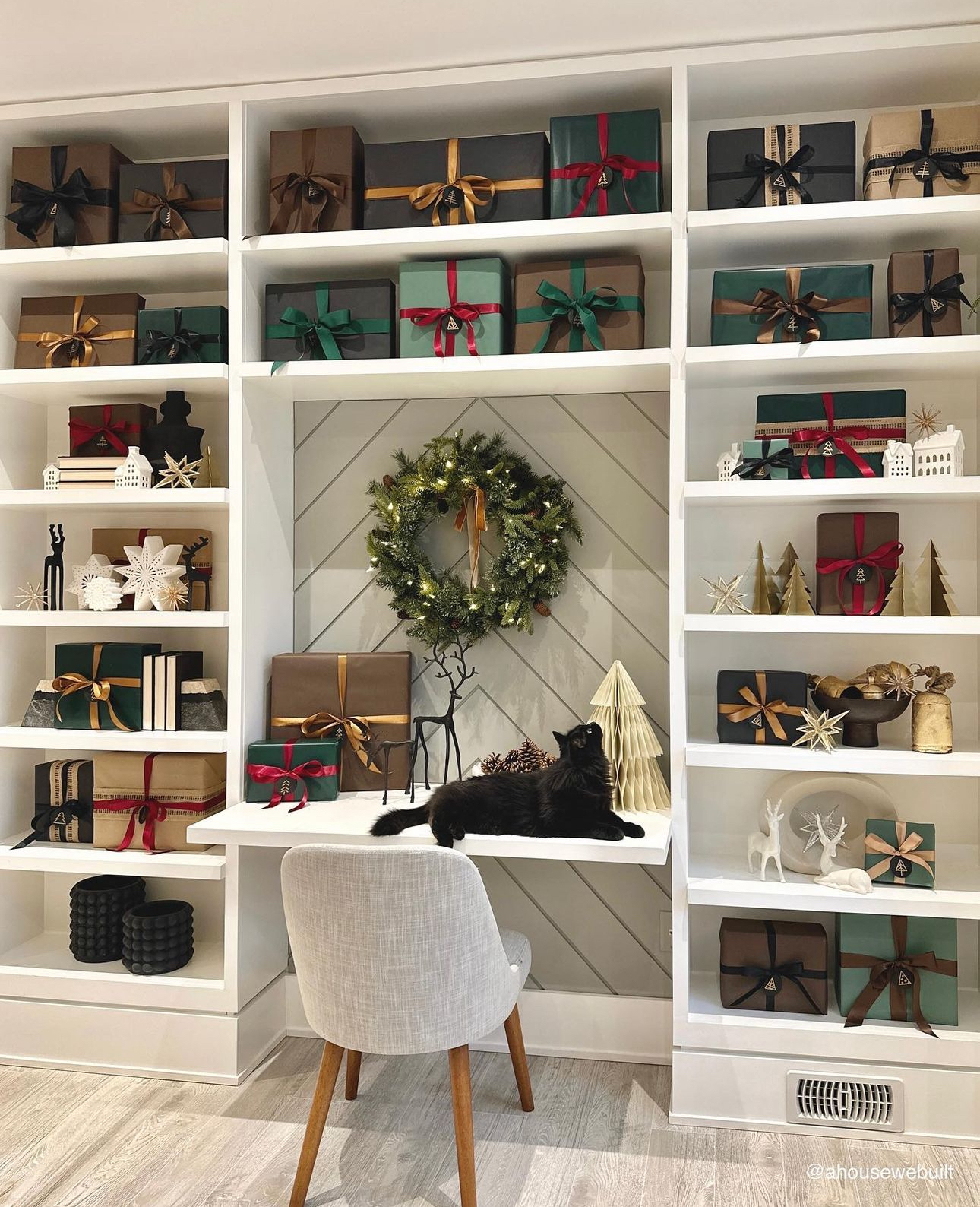 An office nook is a perfect spot to bring in some Holiday decor. The festive wreath in the center of the built-in shelves paired with the wrapped presents make a sophisticated look. A couple of decorative touches, like twinkling lights or a small garland, can really complete the cozy, Holiday vibe.