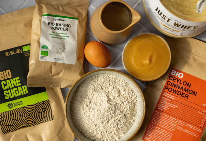We start by preparing the batter. Mix flour with sugar, protein, baking powder, ginger, cinnamon and cloves. Then we add apple puree, egg, milk, oil and mix until we have a smooth batter. We fill silicone doughnut moulds with this.
