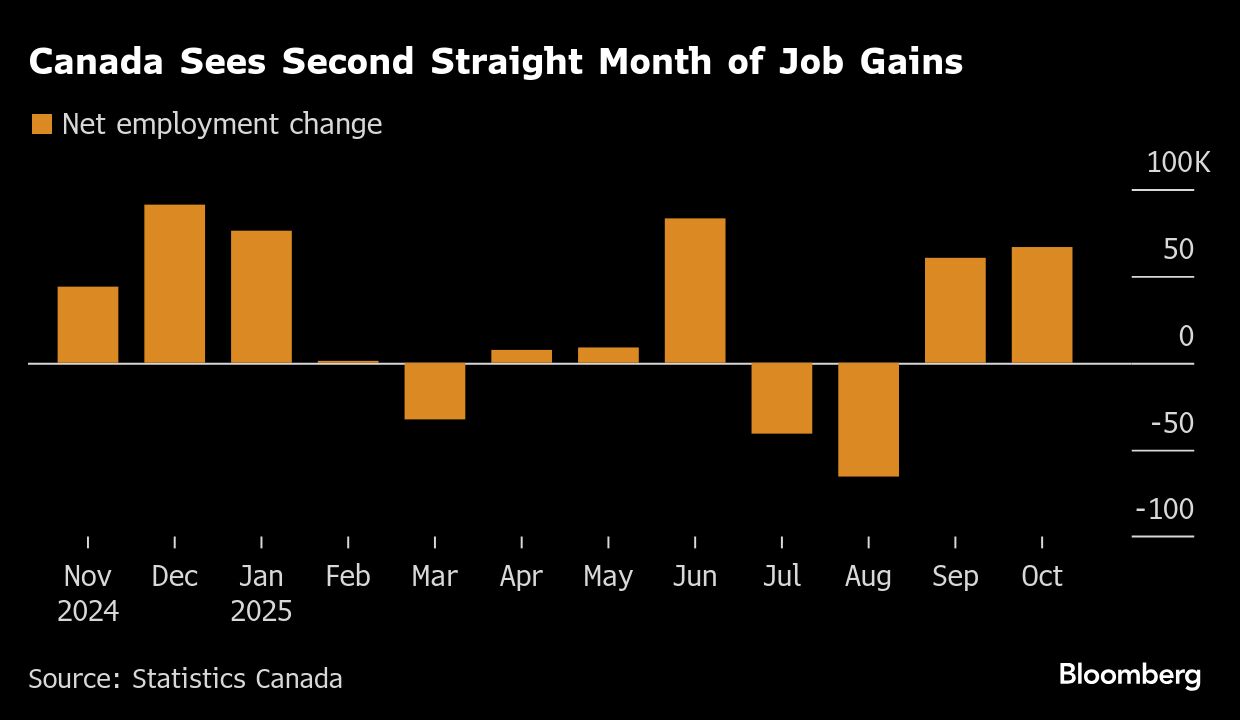 (Bloomberg) — The Canadian economy added 66,600 jobs in October, marking a second consecutive month of surprise employment gains as tariffs otherwise slow down economic activity.