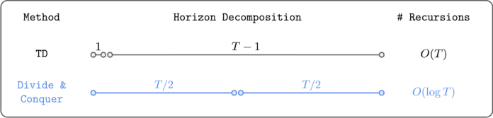The key idea of divide and conquer is to divide a trajectory into two equal-length segments, and combine their values to update the value of the full trajectory. This way, we can (in theory) reduce the number of Bellman recursions logarithmically (not linearly!). Moreover, it doesn’t require choosing a hyperparameter like $n$, and it doesn’t necessarily suffer from high variance or suboptimality, unlike $n$-step TD learning.
