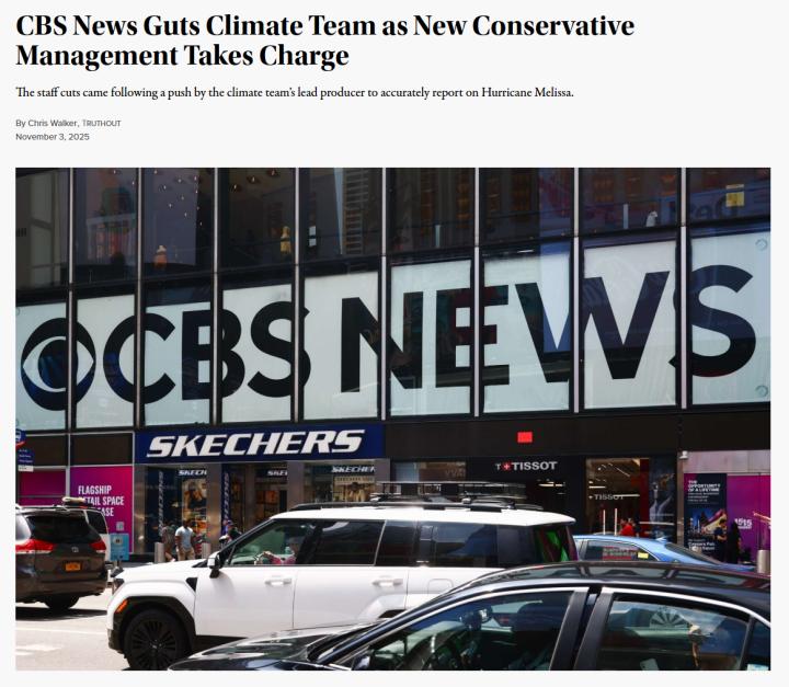 At the heart of the melodrama was Tracy Wholf, the now-former head of CBS’s climate desk, who had urged colleagues to insert a line into hurricane coverage reading: “The above-average Atlantic Ocean temperatures, made worse by climate change, helped Melissa rapidly intensify into a category 5 storm.” That suggestion was presented in Truthout as “accurate reporting.” In reality, it was speculative editorializing—a sentence of moral certainty grafted onto a story about weather.