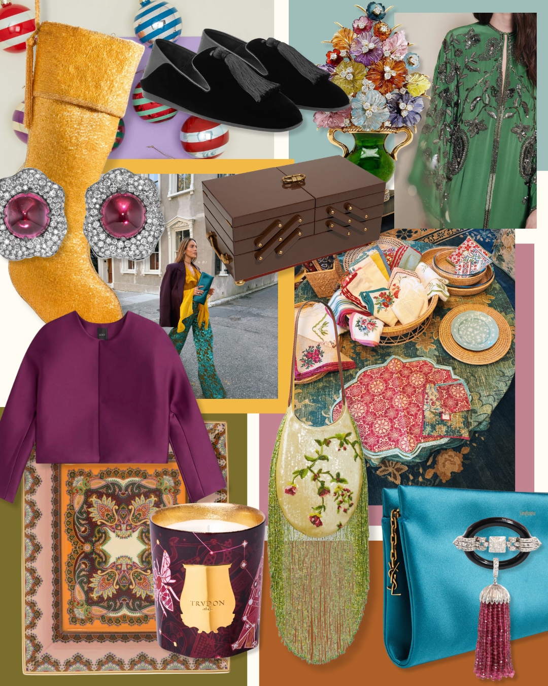 This month, I’m craving pieces that feel layered, moody, and a little jewel-box-like. There’s a thread of opulence that keeps catching my eye— velvet, jewel tones, candlelight, a mix of old-world and playful touches.