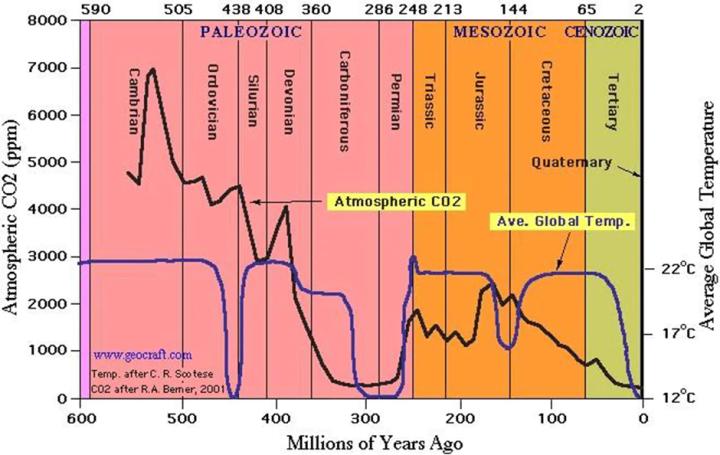 Let us consider some of these observations starting with the long term record over 600 million years. The graph below shows wide temperature-CO2 divergence.