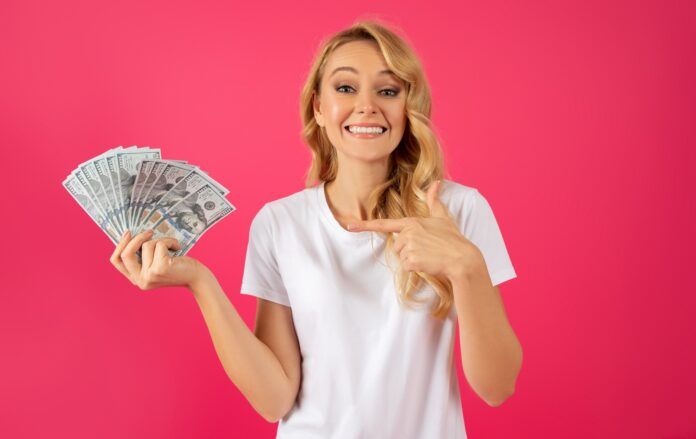 Image source: Shutterstock, blond woman holding a fist full of cash.