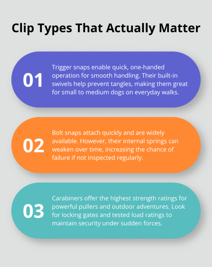 Three main clip types dominate the market with distinct performance characteristics. Trigger snaps offer one-handed operation and include swivel mechanisms to prevent tangling (making them perfect for small to medium dogs). Bolt snaps provide quick attachment but carry higher failure risks as springs weaken over time. Carabiners deliver the strongest performance with load ratings that reach 5,000 pounds, which makes them ideal for large or powerful dogs during outdoor adventures.