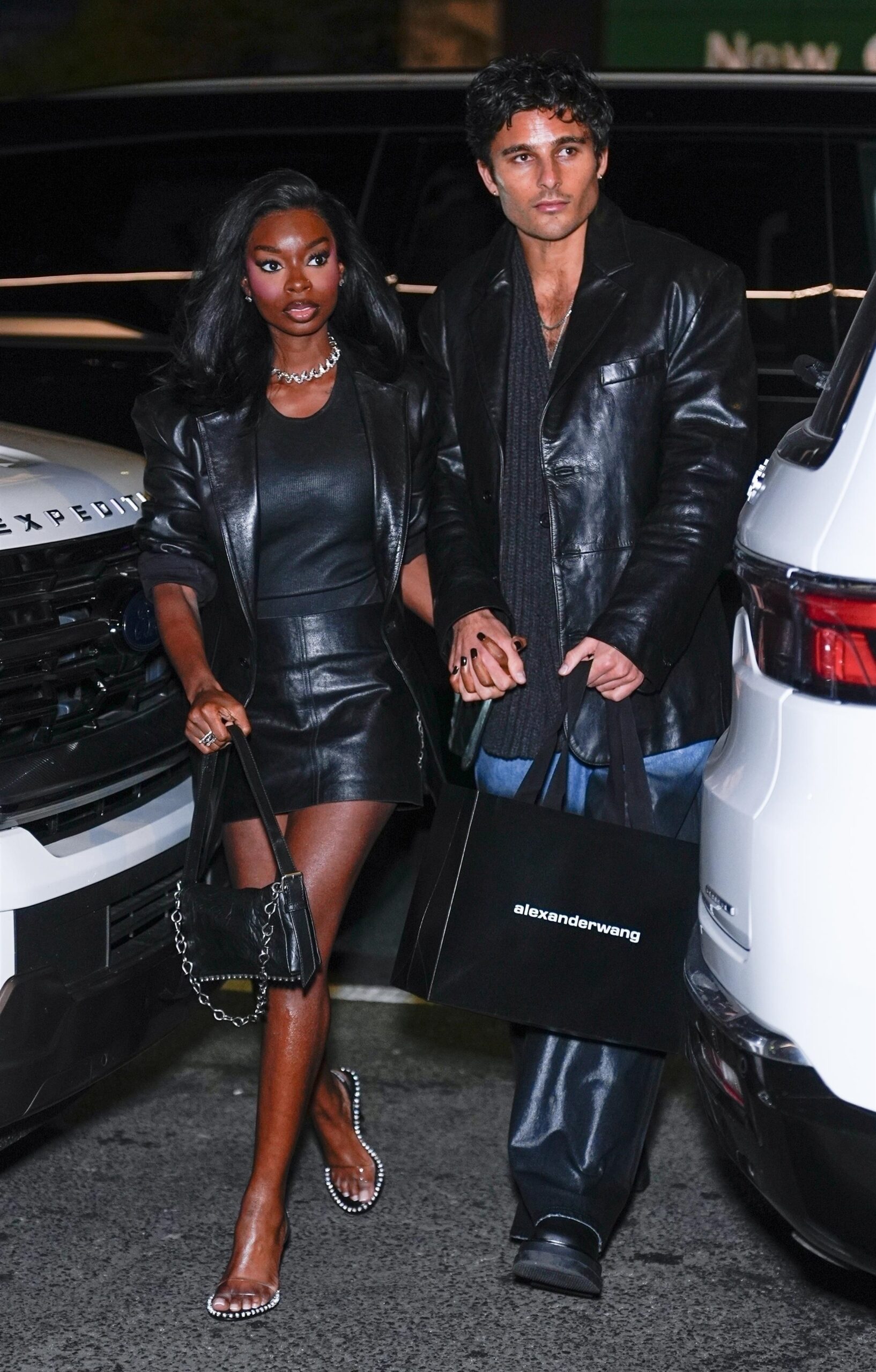 The stylish pair turned heads in coordinated all-black leather looks from the brand—Olandria wore a structured blazer with a matching mini skirt and crystal-embellished heels, while Asher opted for a relaxed black leather jacket layered over a ribbed knit top and loose trousers.