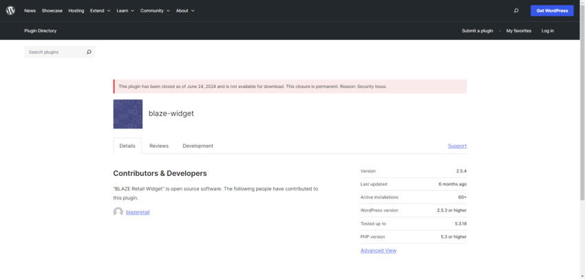 Unlike Social Warfare which was patched, some of these plugins have been delisted. For instance, this is what the plugin page looks like for BLAZE widget: