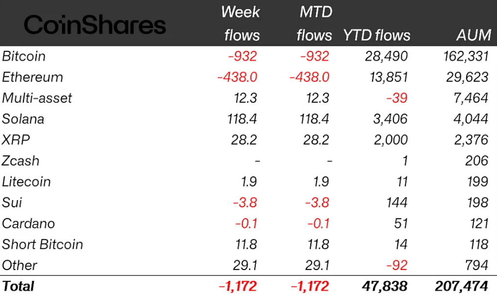 Mirroring the prior week, Bitcoin (BTC) ETPs led the outflows last week with $932 million, slightly down from $946 million the week before.