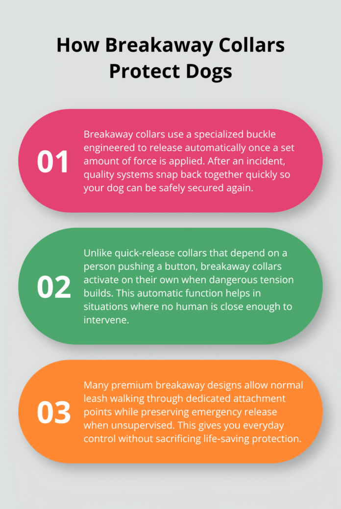 The KeepSafe Break-Away Collar stands out as the most reliable option across all dog sizes, with its patented safety buckle that consistently releases at predetermined pressure levels and reattaches instantly after emergencies. Small breeds under 25 pounds need lightweight release mechanisms at 5-8 pounds of pressure, while medium dogs (25-60 pounds) require upgraded systems with 8-12 pound thresholds. Large breeds over 60 pounds demand reinforced breakaway mechanisms rated for 12-15 pounds to prevent accidental releases during normal activities while they maintain life-saving protection.