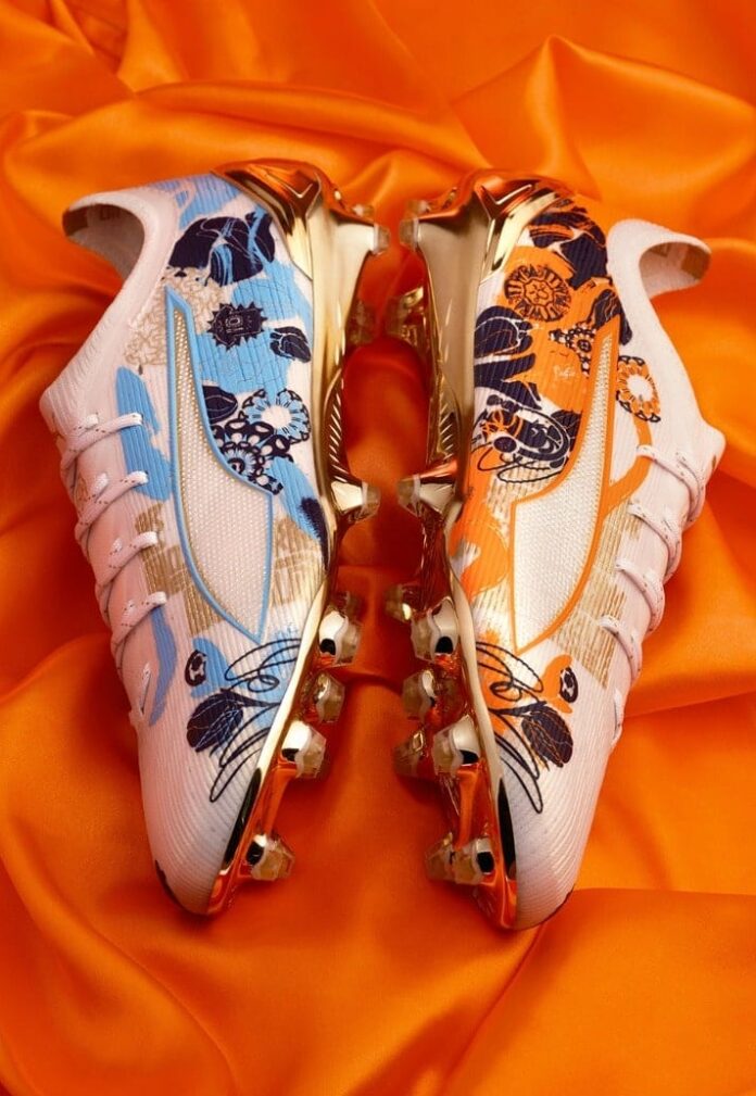 Built on a white base, the boots feature contrasting colourways: one in blue and black to reflect family, faith, and culture, the other in orange and black to capture his footballing triumphs. Details include his famous lion tattoo, the number 10, tributes to his Ghanaian roots, and a nod to his mother, Cora.