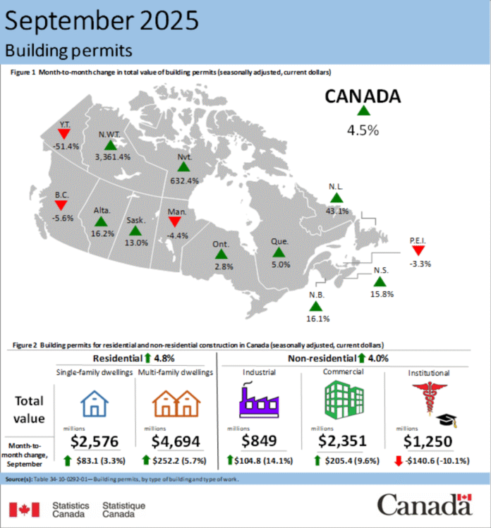 The total value of building permits issued in Canada climbed 4.5% in September to $11.7 billion, according to Statistics Canada.