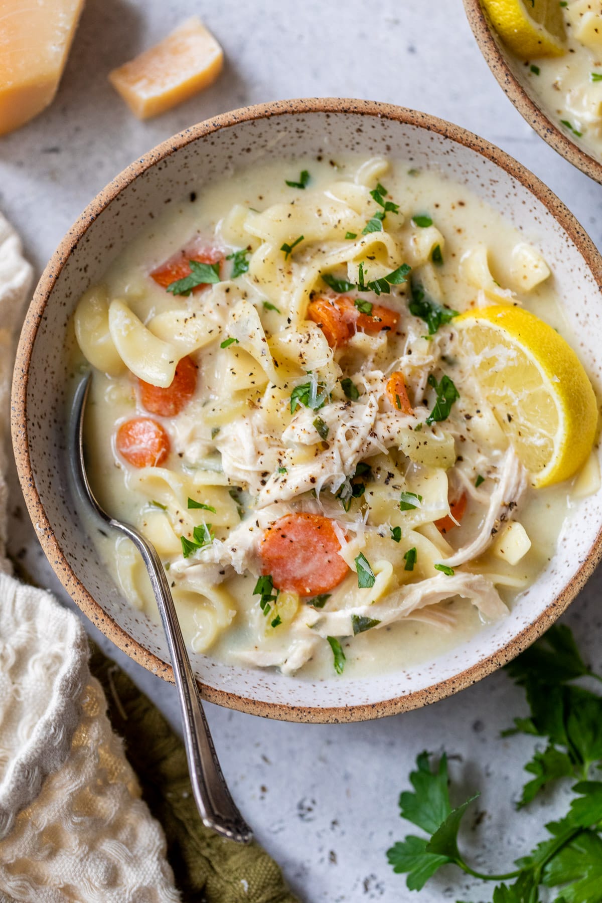 A bowl of creamy turkey noodle soup with carrots, parsley, a lemon wedge, and a spoon on the side.