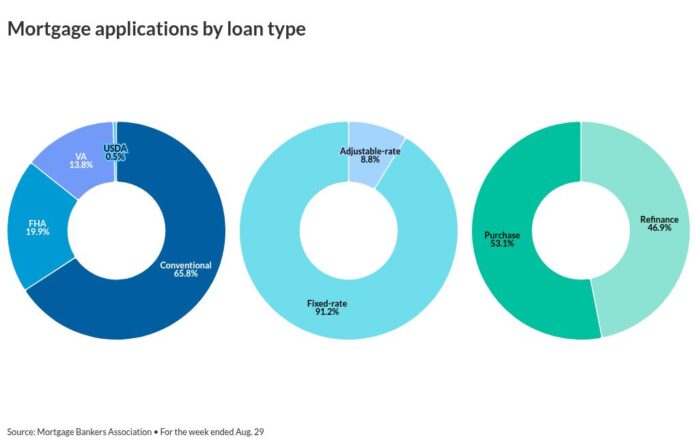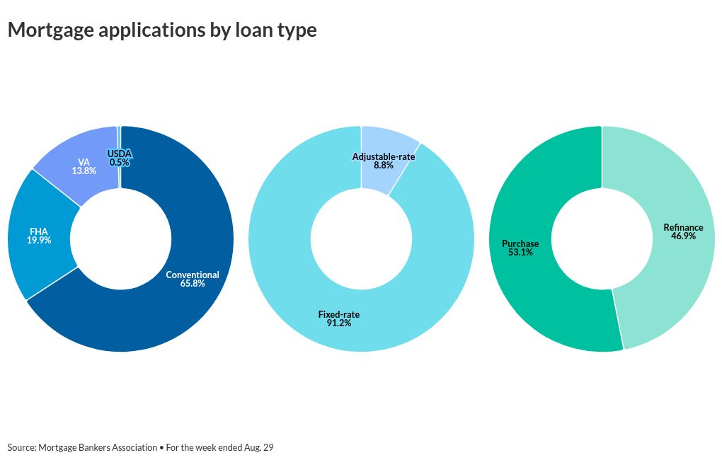 FHA-backed applications garnered a 19.9% share of total volume, up from 19.1%, while VA-guaranteed loans grew to 13.8% from 13.3%. The portion of mortgage applications coming through the