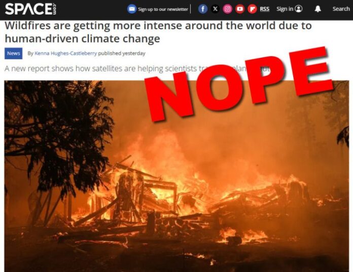 The SPACE.com article, “Wildfires are getting more intense around the world due to human-driven climate change,” is based on a single study published in the journal Earth System Science Data (ESSD), “State of Wildfires 2024-2025,” which makes the unscientific claim that a single year of severe wildfires provides proof that climate change is causing an increase in wildfires.
