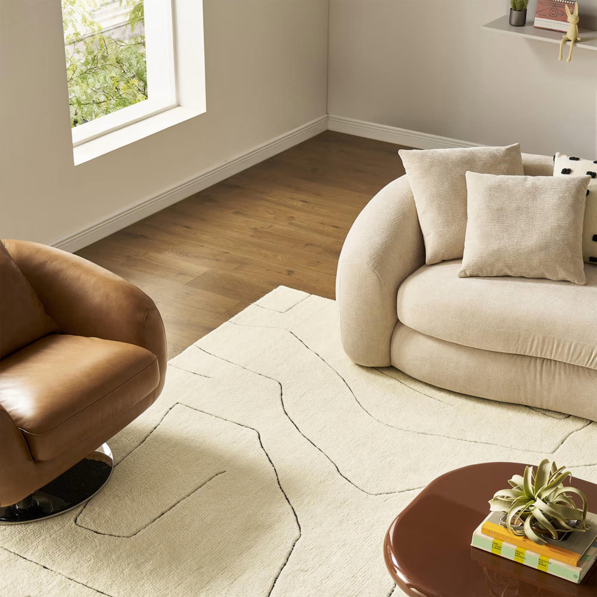 Lately, I’ve been drawn to pieces that layer beautifully on their own — a boucle chair beside a stone table, or a cozy rug paired with linen drapery. Here are a few favorites: