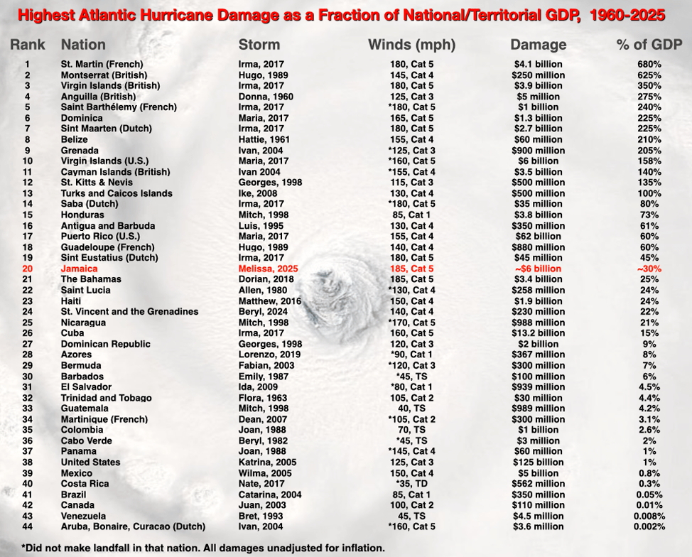 Figure 1. The costliest Atlantic hurricane relative to GDP for each nation/territory, 1960-2025. Dollar amounts are unadjusted for inflation. Strength of the hurricane is given for landfall in that nation; Hurricane Mitch (1998) was a Cat 5 offshore of Honduras and Guatemala when it did much of its damage in those nations. GDP data is unreliable in many places before 1990. (It may be that Martinique’s costliest hurricane relative to GDP was Hugo in 1989, but no reliable GDP data exists that year.)