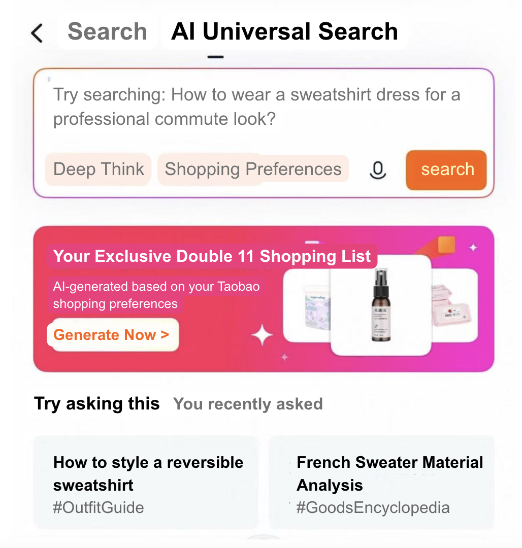 Source: Taobao App search bar. AI Universal Search is introduced as a separate tab, accompanied by user-assistance features like “Try asking this way” and a “prompt guide.”