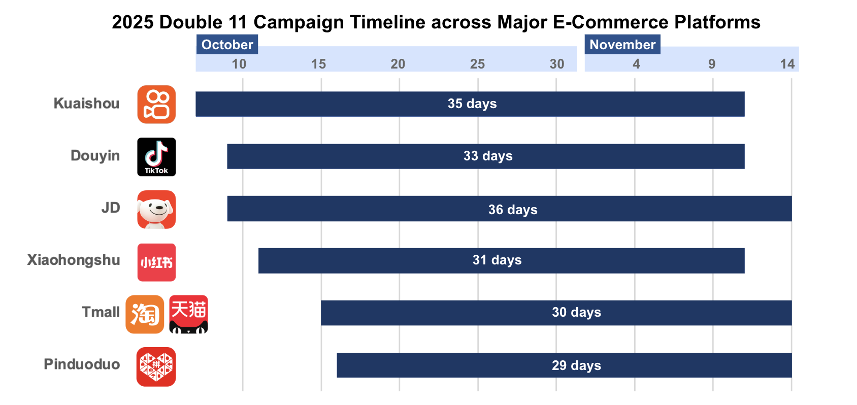 Source: Each company’s official data, designed by Daxue Consulting, provides the 2025 Double 11 Campaign timeline across major e-commerce platforms