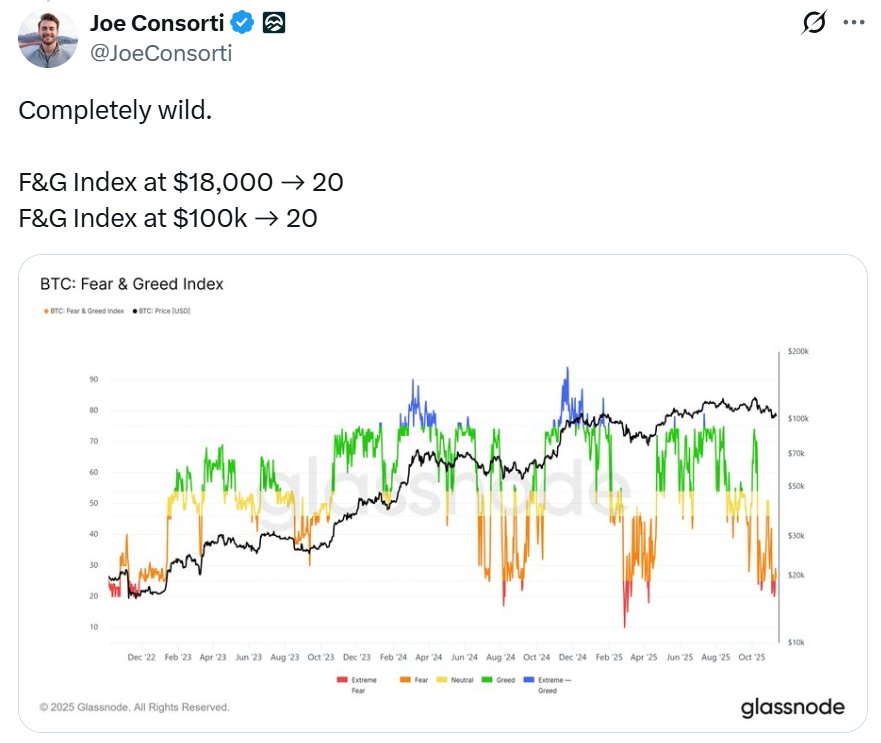 Joe Consorti, head of Bitcoin growth at trading and liquidity protocol Horizon, said the overall sentiment among traders is at the same level it was in 2022, when Bitcoin was around $18,000, citing data from Glassnode.