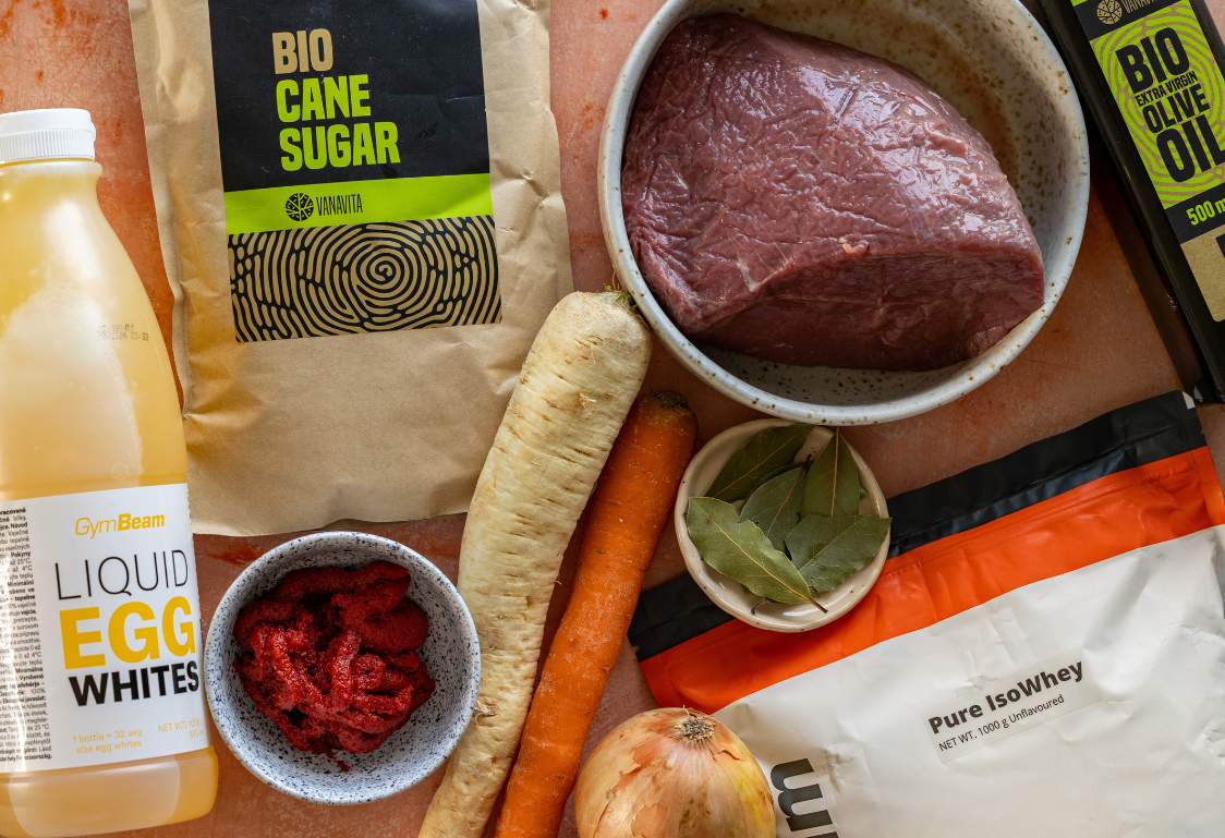 Place the meat in a pot, cover with water and bring to a boil. Remove the foam from the surface, then add salt, bay leaf, allspice, pepper, and cook the meat covered on low heat until tender. This will take approximately 2–3 hours. When cooked, strain the broth from the meat, which we will then use for the sauce. In another pot, sauté the finely chopped and cleaned carrot, parsley root and onion in oil until translucent. Then add sugar and let the vegetables caramelise. Next, add the tomato paste, which we also briefly sauté.