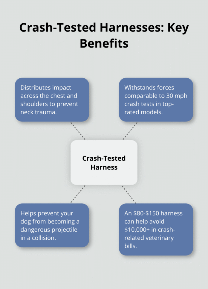 Standard dog seat belts attach to your car’s existing belt system but provide minimal crash protection. True safety harnesses distribute impact forces across your dog’s chest and shoulders, which prevents neck injuries that kill thousands of pets annually. These harnesses cost between $80 and $150 but can prevent veterinary bills that exceed $10,000 for crash-related injuries.