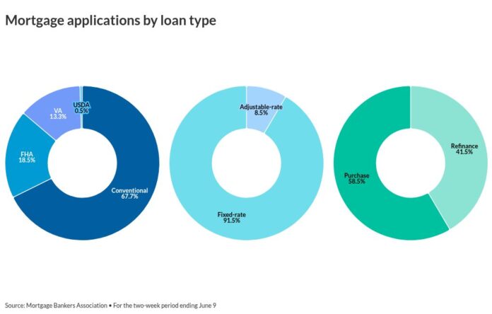 The breakdown of government-backed loans remained mostly unchanged from the week before. FHA applications made up 18.8% of all mortgages while Department of Veterans Affairs-backed mortgages accounted for 12.2%, a notable drop from last week’s 13.3%. Applications for mortgages backed by the U.S. Department of Agriculture decreased, constituting 0.5% of the total.
