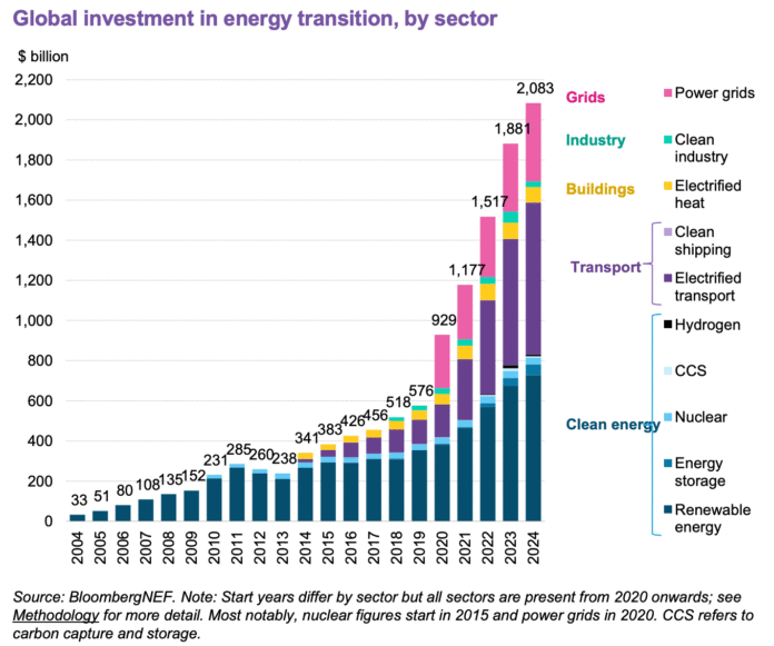 First, the vast majority of spending on climate mitigation worldwide is not in low income countries, and there is little reason to assume that cutting it would free up resources for development aid. The world spent more than two trillion on clean energy technologies (albeit somewhat expansively defined) in 2024, but the overwhelming majority of this was spent by middle- and high-income countries (e.g. China, the US, the EU, the UK, India, Japan, etc.) to build domestic clean energy, build transmission, buy electric vehicles, electrify heating, etc.