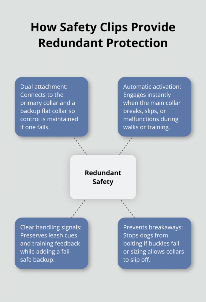 Safety clips serve as backup connection systems that connect your dog’s collar to their leash or harness through a secondary attachment point. The Herm Sprenger Safety Clip demonstrates this design by attaching to both training collars and flat collars simultaneously, which creates redundant security when one system fails. These devices activate automatically when primary collar mechanisms malfunction and prevent your dog from breaking free during walks or training sessions.