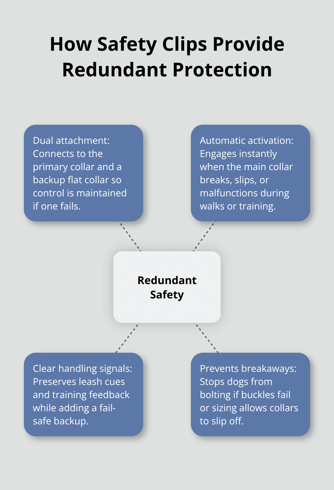 Safety clips prevent the 26,000 annual collar-related accidents that occur when standard collars fail at critical moments. When dogs catch their collars on furniture, fence posts, or other dogs during play, these devices release automatically to prevent strangulation within seconds. Most pet owners still rely on single-point attachment systems that offer zero backup protection when buckles break or collars slip off.