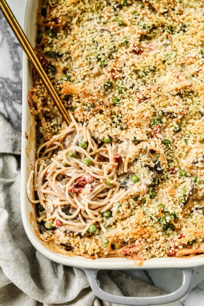 Turkey tetrazzini turns leftovers into a hearty casserole! With mushrooms, peas, and pasta in a cheesy cream sauce, it’s total comfort food.