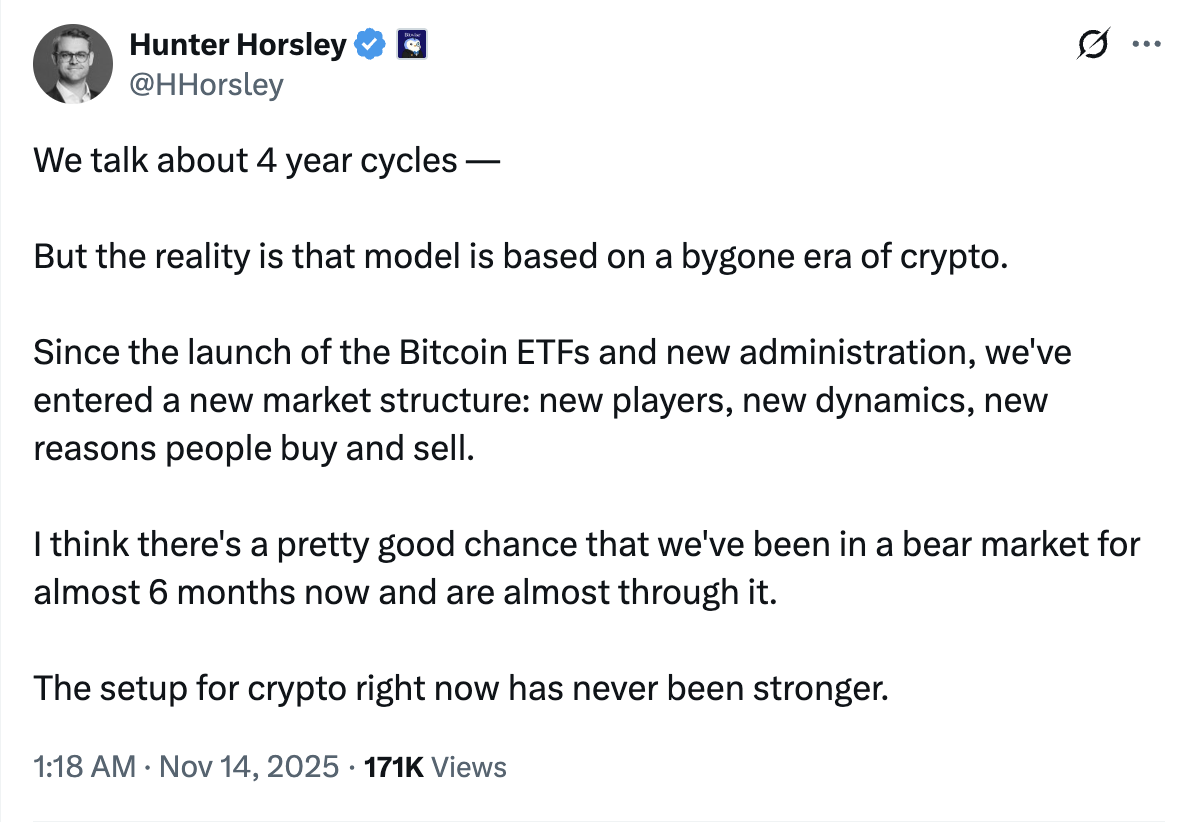 Horsley said the four-year market cycle is dead, replaced by a more mature market structure and changed dynamics due to the pro-crypto regulatory pivot in the US. He said in a Friday X post: