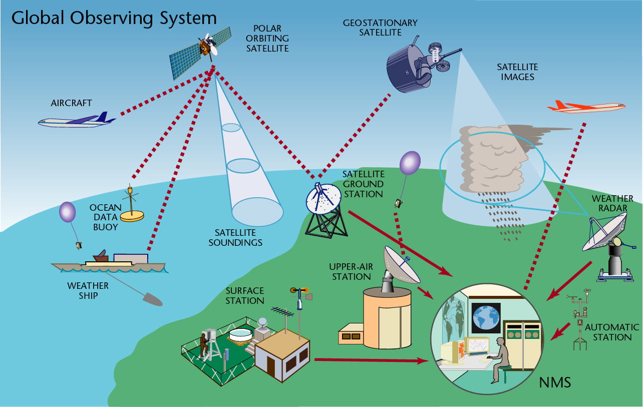 Figure: Schematic of the global observing system from the World Meteorological Organization https://community.wmo.int/en/observation-components-global-observing-system
